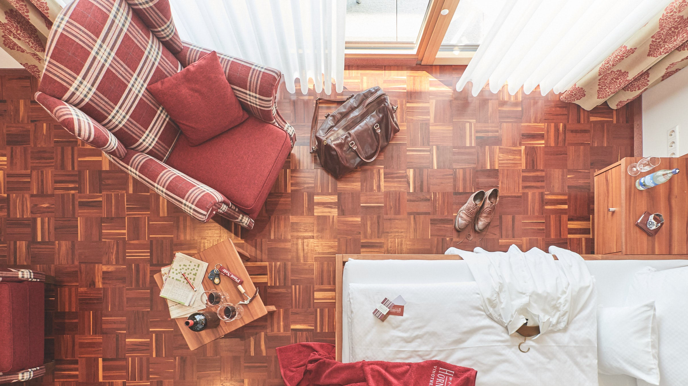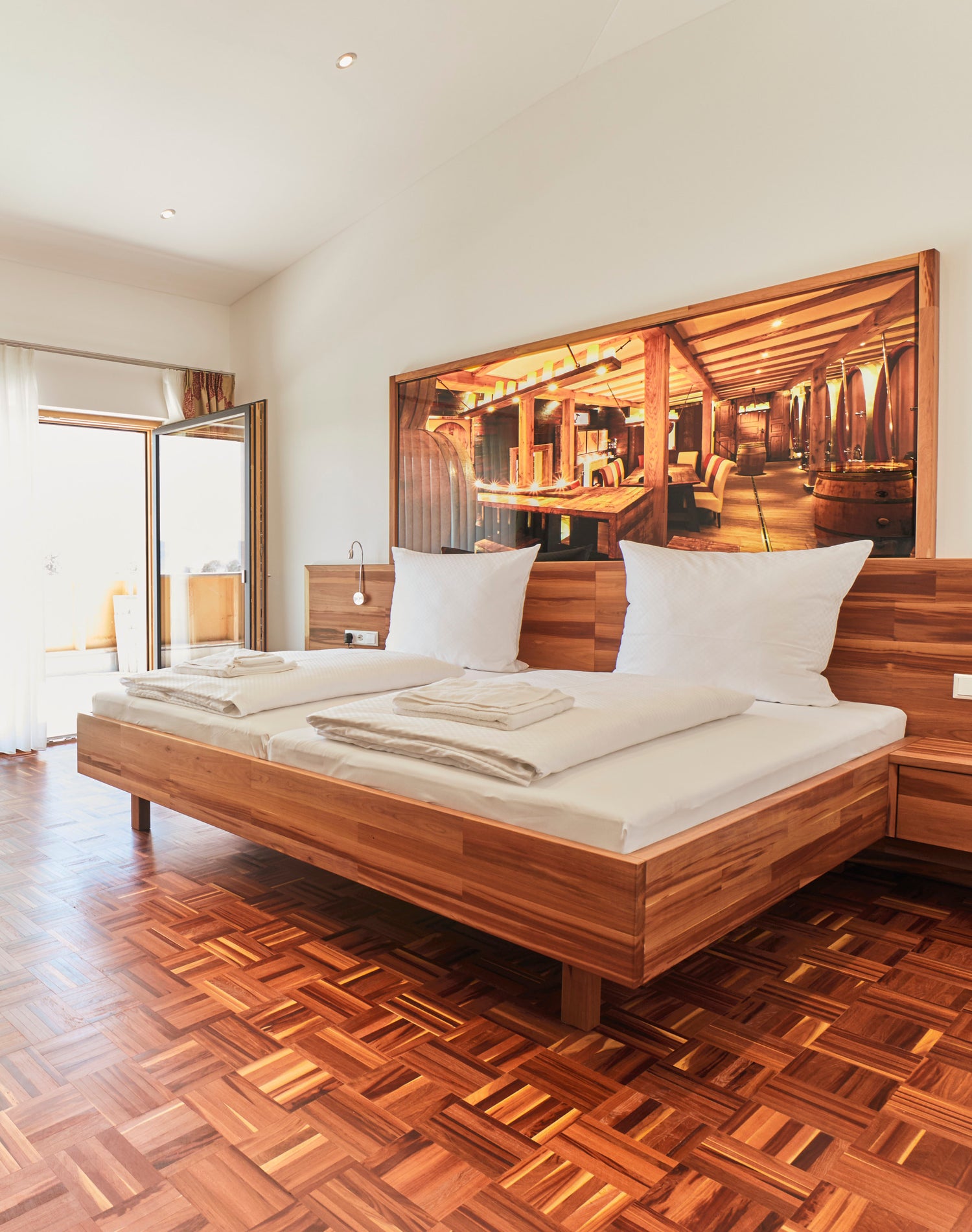 The interior of these rooms enchants with its harmonious design and well-thought-out furnishings. Natural materials such as our solid wood are used in particular and bring nature into the interior of the white wine rooms. Light-flooded rooms underline the spacious layout. Comfortable upholstered furniture invites you to linger and enjoy the magnificent view of the mountains and Lake Constance.